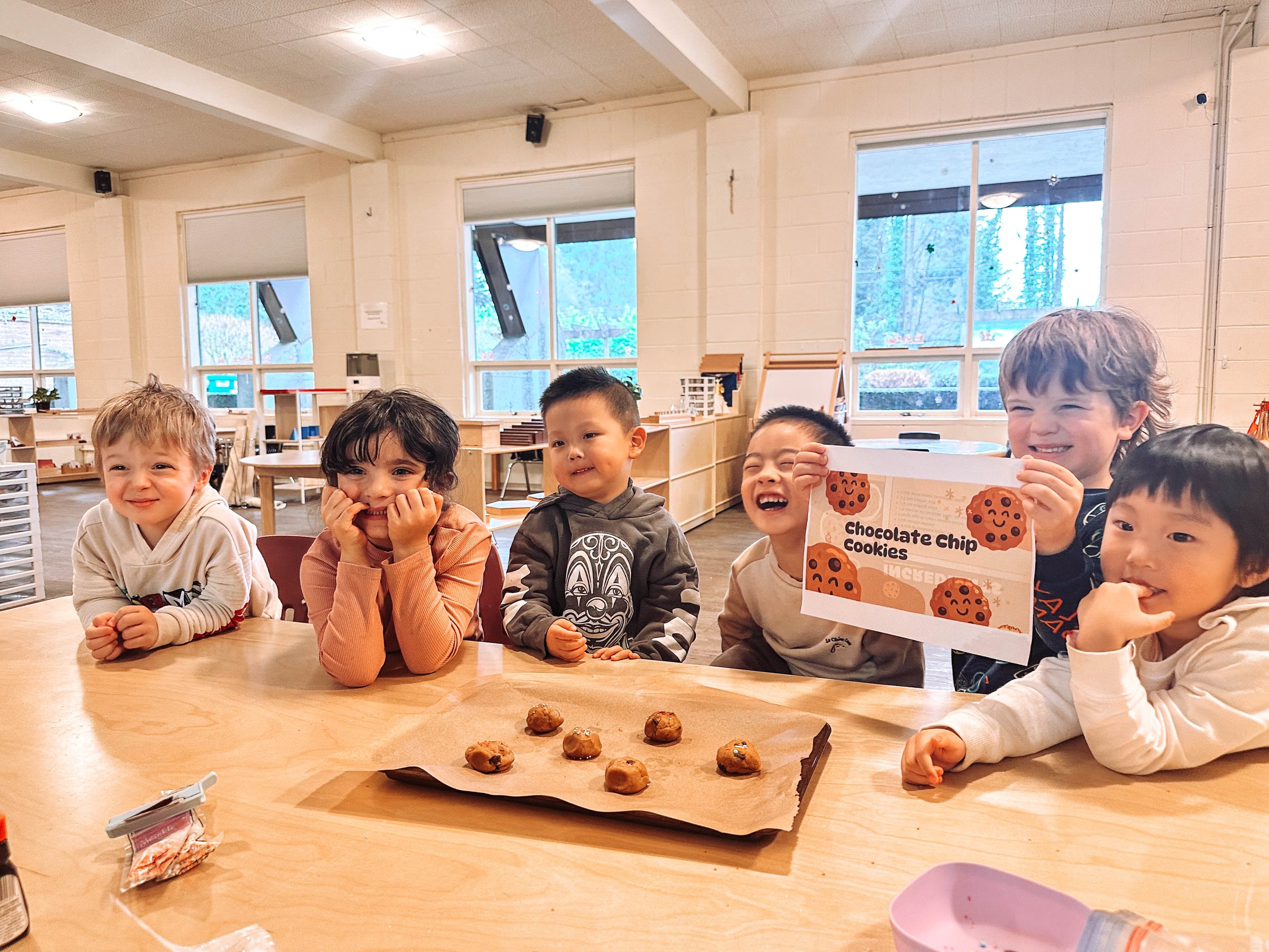 Children sitting around a table with cookies, one child holding a sign that reads 'Chocolate Chip Cookies,' smiling and happy in a classroom setting.
